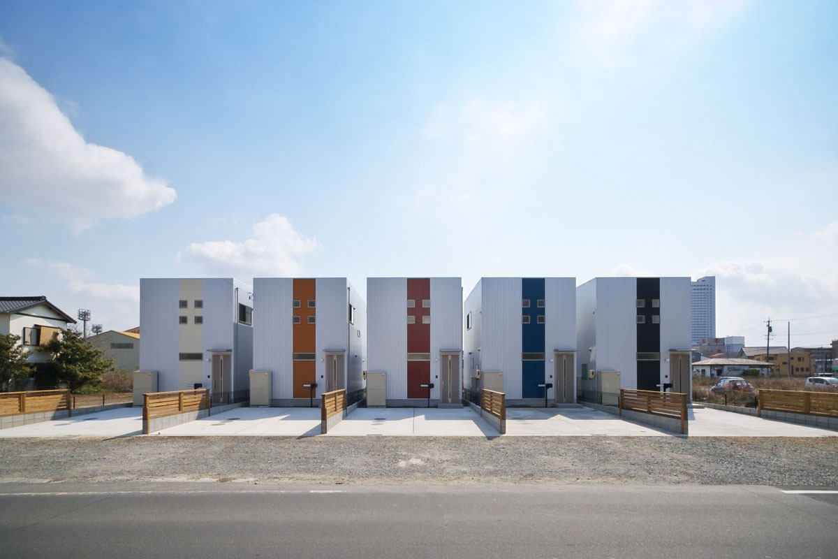 縦のラインが美しいメタル調のサイディングは何気なく通りがかっただけでも印象に残る、モダンな外観。田の字型に配置した窓をアクセントにすることで可愛らしさもプラスした。外壁のアクセントカラーはすべての棟で違うカラーとし、それぞれの個性を出せるデザインにした。駐車スペースのウッドフェンスで、ナチュラルなエクステリアにし、まるでアメリカの住宅街のような雰囲気づくりをした。