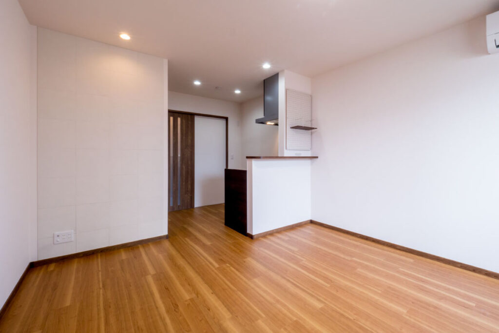 洗面室やトイレなど随所に可愛らしいアクセントクロスを使用することで、冷たい印象になりがちな水回りも明るく見えるようコーディネートした。フローリングや建具は木目の質感がしっかりと出るデザインをセレクト。暖かみと高級感を両立させたカラーにしている。浴室の壁をフローリングに寄せる拘りで、部屋全体に統一感を持たせた。