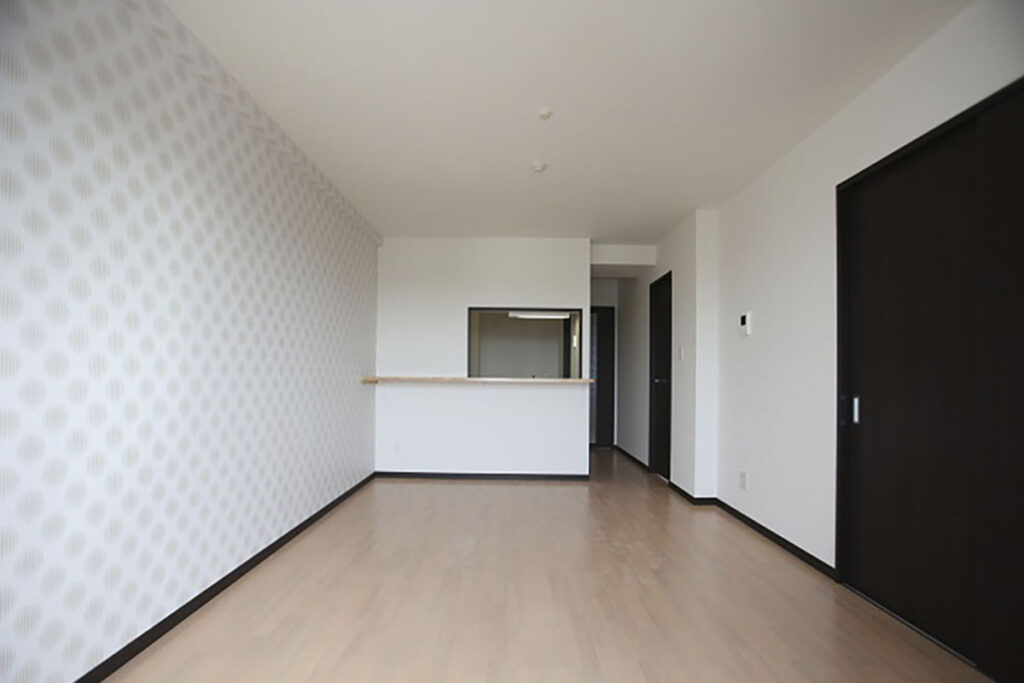 対面キッチンにカウンターを備え付け、配膳をスムーズにするのはもちろんのこと、軽い食事もできるスペースを確保した。内装もシンプルモダンをイメージしており、建具はダークカラーを用いた。重たい印象にならないよう、床はメープルカラーを使用。シックかつ明るいコーディネートとした。
