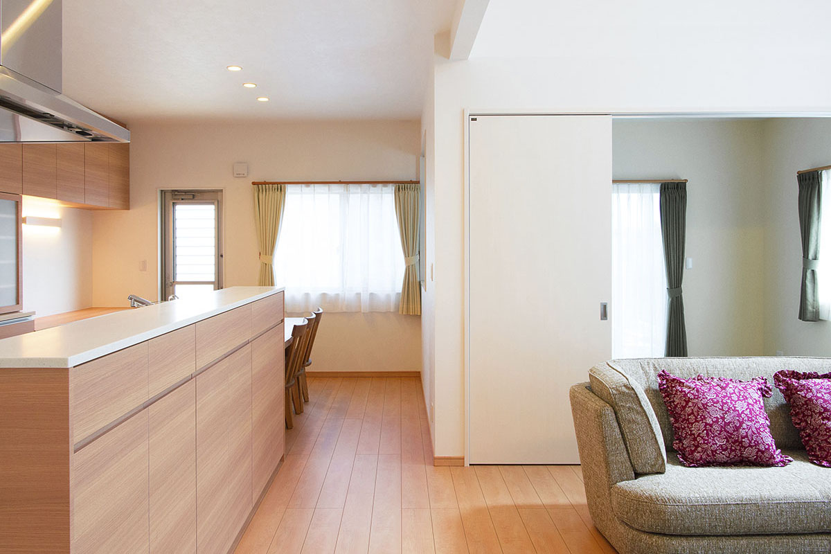 施主様のキッチンへのこだわりがあり、部分的に特注の設計である。特に日々の家事を考え、家事動線を意識した配置。キッチンの横に食事スペースを設置して効率化、またキッチンからパントリー、家事室、洗面所へと直線的な家事動線を実現した女性に優しい家と言える。