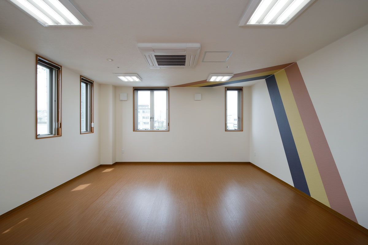 「虹」をコンセプトにした老人ホームは外観はもちろん、内装にも虹のペイントを施した。外壁は落ち着いたブラウンを基調とし明るいベージュ、ホワイトの窓モールディングで重たくならないようデザイン。